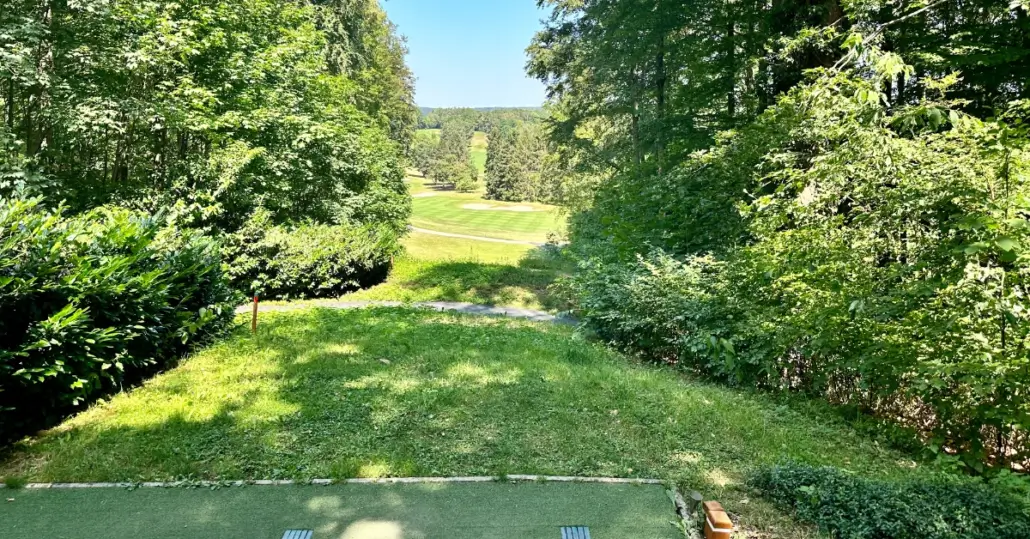 Der Platz war in den späten 1980er- und frühen 1990er-Jahren Austragungsort der Linde German Masters, was seine Qualität als anspruchsvollen Turniertest untermauert. Auch wenn neuere Anlagen wie St. Leon-Rot die Rolle im Profizirkus übernommen haben, ist Solitude durch die Überarbeitung wieder fit für große Amateurturniere. Der Platz spielt sich wie ein eleganter, strategischer Parkland-Klassiker. Die Fairways sind zwar relativ großzügig, aber der Platz ist weit davon entfernt, eine Autobahn zu sein. Die Runde beginnt sofort fordernd und die ersten neu Löcher sind mit die interessantesten, die ich bisher in Deutschland gespielt habe. Ein äußerst unterhaltsames Auf und Ab! Hier ist der Driver oft die riskantere Wahl, denn wer zu gierig ist, findet sich schnell im dichten Wald oder in einem strategisch platzierten Bunker wieder. Die Topografie sorgt dafür, dass man selten einen komplett ebenen Stand hat, was jeden Schlag zusätzlich verkompliziert. Bahn 2 bietet gleich einen herrlichen Schuss ins Tal, während man ab Bahn 4 (nach einem besonders bemerkenswerten, steilen Aufstieg, liebevoll „Via Mala“ genannt) in einen sehr strategischen und schicken Teil des Platzes kommt. Die drei aufeinanderfolgenden Par 4s sind schlichtweg spaßig und genial. Eisen oder Driver ist die Frage auf den Bahnen 4 und 5, während die Bahn 6 einen der geilsten Abschläge ever bereithält: weit bergab durch eine optisch sehr enge Schneise. Das folgende Par 5 ist bei gutem Abschlag mit dem zweiten Schlag zu erreichen. An der Bahn 9 kommt dann beim Schlag ins Grün erstmalig Wasser ins Spiel. Eigentlich mit 345 Metern von Gelb kein Thema, aber der Teich schützt das Grün sehr schön, und zudem sind die neugierigen Blicke der Terrasse im Weg…